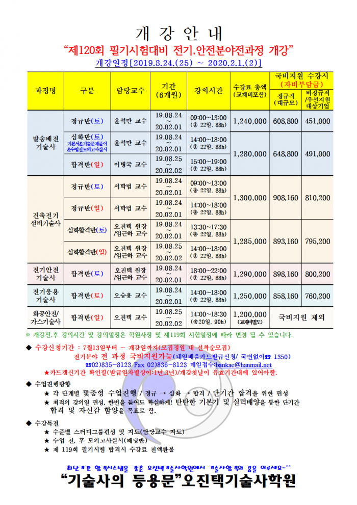 2019년 8월 전기분야/화공안전,가스기술사 개강안내