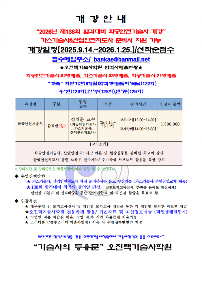[화공안전기술사 개강] 2025년 9월 개강일정 안내