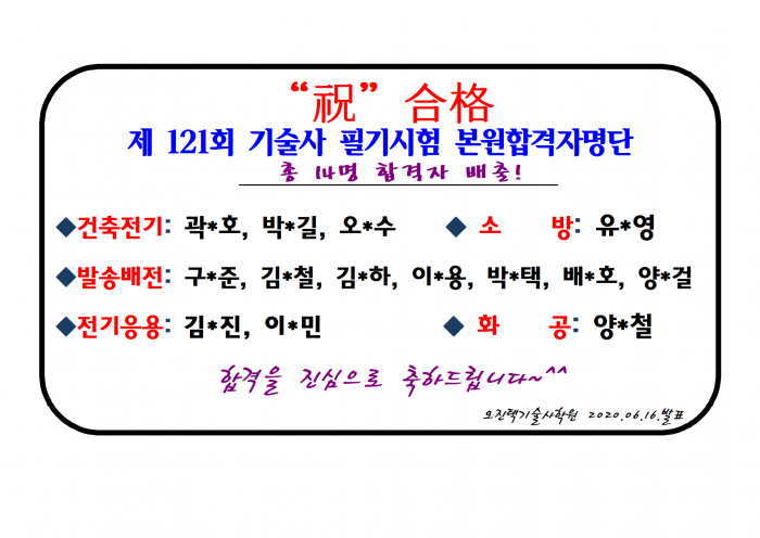 "경축"제121회 기술사 필기시험 본원합격자명단[2020년6월16일 발표]