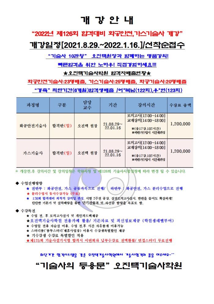 "개강"8월29일/화공안전기술사,가스기술사 개강안내[선착순접수중]