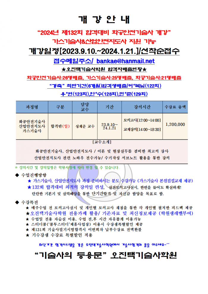 [개강]2023년9월 화공안전기술사 개강안내