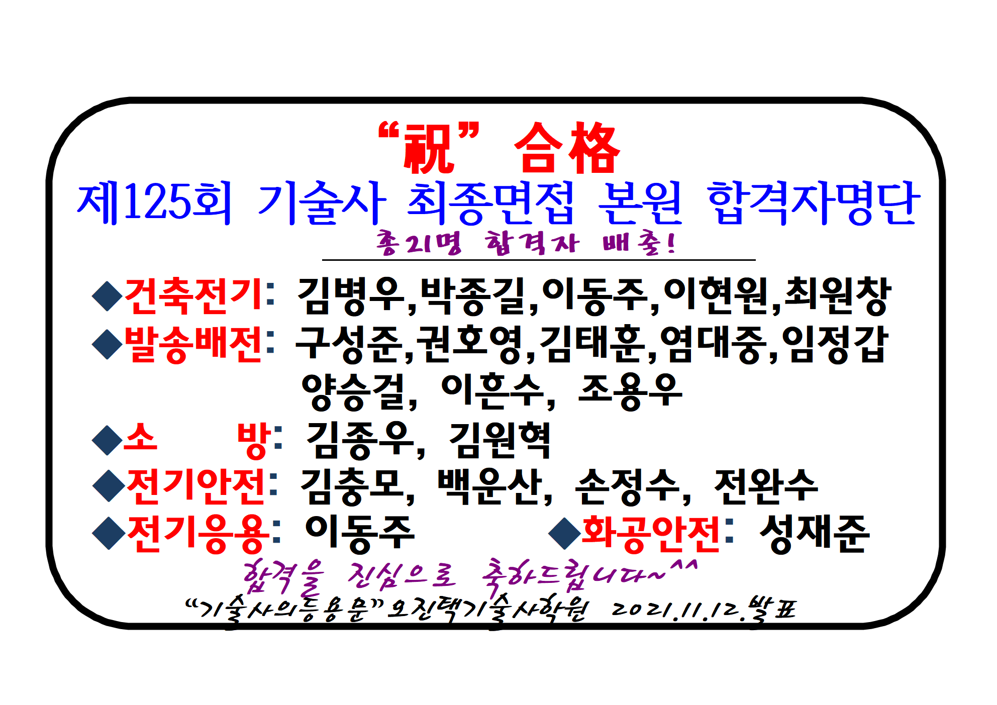 이동주기술사님께서는 전기안전기술사에 이어, 제125회 건축전기,전기응용 동시합격으로 3관왕 달성이시네요~ 축하축하드립니다^^